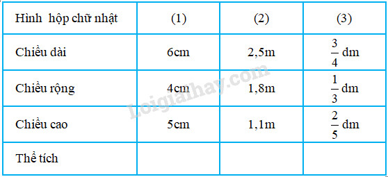 Muốn tính thể tích hình hộp chữ nhật ta lấy chiều dài nhân với chiều rộng rồi nhân với chiều cao (cùng một đơn vị đo).