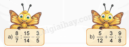 a) $\frac{8}{7}:\frac{{15}}{{14}} – \frac{3}{5} = \frac{8}{7} \times \frac{{14}}{{15}} – \frac{3}{5} = \frac{{16}}{{15}} – \frac{3}{5} = \frac{{16}}{{15}} – \frac{9}{{15}} = \frac{7}{{15}}$