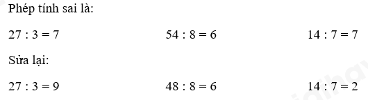 Sử dụng bảng chia để kiểm tra kết quả của các phép tính sau, nếu sai thì sửa lại cho đúng: