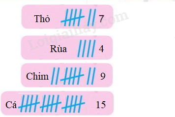 Xem tranh rồi đếm số lượng mỗi con vật và ghi lại kết quả theo ví dụ mẫu.