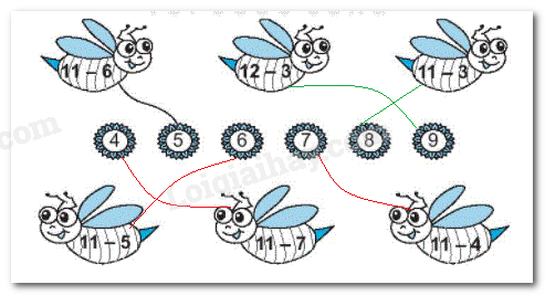 Tính nhẩm kết quả các phép trừ ghi trên mỗi con ong rồi nối với số thích hợp trên ghi mỗi bông hoa.