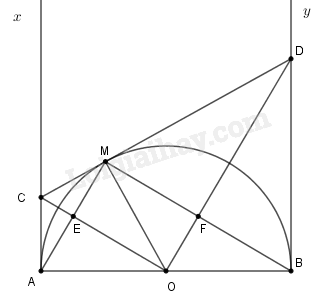 Cho nửa đường tròn tâm \(O\), đường kính \(AB = 2R\). Trên nửa mặt phẳng có bờ là \(AB\) chứa nửa đường tròn, vẽ tiếp tuyến \(Ax,\,\,By\). Từ điểm \(M\) tùy ý thuộc nửa đường tròn (\(M\)khác \(A,B\)) vẽ tiếp tuyến tại \(M\) cắt \(Ax,\,\,By\) lần lượt tại \(C,\,\,D\). Gọi \(E\) là giao điểm của \(CO\) và \(AM\), \(F\)là giao điểm của \(DO\) và \(BM\).