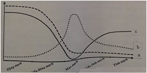 Câu 98: Độ lớn của huyết áp, vận tốc máu và tổng tiết diện của các mạch máu trong hệ mạch của cơ thể động vật được thể hiện ở hình bên.