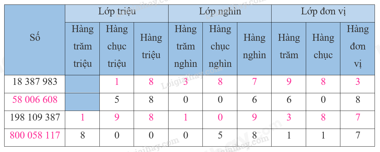 – Viết số lần lượt từ hàng trăm triệu, hàng chục triệu, hàng triệu, hàng trăm nghìn, hàng chục nghìn, hàng nghìn, hàng trăm, hàng chục, hàng đơn vị.