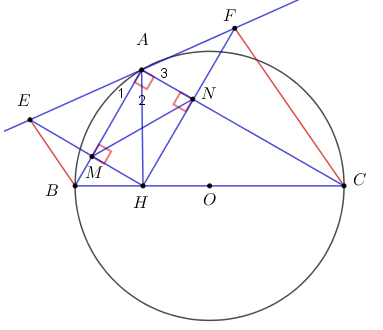 3) Đường thẳng đi qua A cắt tia HM tại E và cắt tia đối của tia NH tại F. Chứng minh BE // CF.