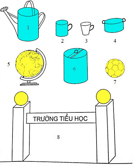 Trong mỗi hình vẽ đồ vật sau, hãy tô màu vào phần có dạng hình trụ, dạng hình cầu.