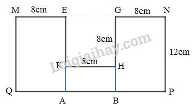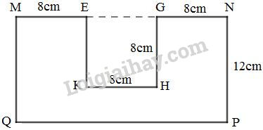 – Diện tích miếng bìa = diện tích hình chữ nhật MNPQ \(-\) diện tích hình vuông EGHK.