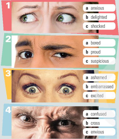 For each photo, choose the adjective (a – c) that matches how the person is feeling.