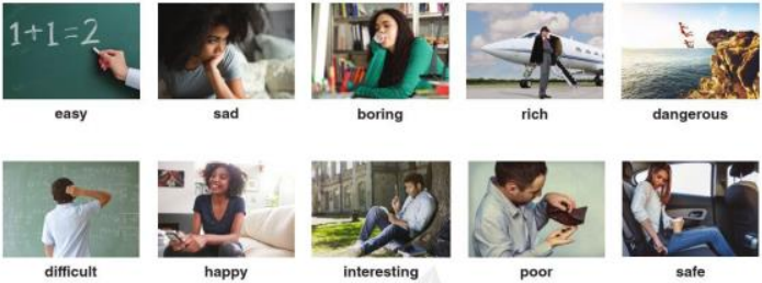 A. Write the adjectives in the correct column. B. Which adjectives normally describe: C. Read the sentences. Circle the adjective that you agree with in each sentence. Compare your answers with a partner. Discuss any differences. D. In pairs, use adjectives to describe the people on page 4. E. Unscramble the words to make sentences. F. Complete the sentences so they are true to you. Share your answers with a partner. G. Two people meet for the first time. Listen and fill in the table. H. Listen