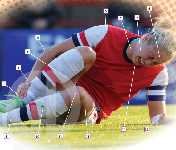 1. SPEAKING Describe the photo. How is the footballer feeling? What has happened, do you think? 2. VOCABULARY Match 1-14 in the photo with parts of the body from the list below. Check the meaning of all the words in the list. 3. SPEAKING Work in pairs. Which parts of the body in the list in exercise 2. 4. SPEAKING Work in pairs or small groups. Do the body quiz on page 37. Check your answers with your teacher. 5. VOCABULARY Listen to three dialogues between doctors and their patients. Complete t