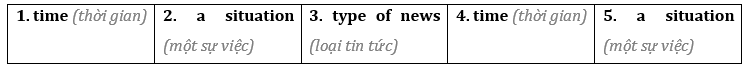 (Bạn chuẩn bị nghe một người thuyết minh trên TV nói về một chương trình tin tức. Đọc bảng bên dưới. Thông tin nào bị thiếu ở mỗi chỗ trống.)