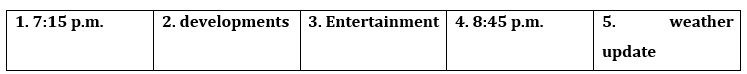 Good afternoon and welcome to Channel 3 News, where we keep you, the viewers, updated on all of the recent and upcoming events that you need to know about. Our scheduled news programming for this evening includes various segments that will take place in the following order. At 7:00 p.m., we will begin the evening’s news programming with the daily headlines, covering the main events within the country in the past 24 hours. At 7:15 p.m., we will begin the in-depth news section, where we discuss both national and international news stories. After that, at 7:45 p.m., we will begin our politics section. In this section, we will discuss new developments related to this year’s election. At 8:15 p.m., we will have our weekly entertainment news section, where our entertainment journalists will discuss a variety of upcoming films and offer reviews of the newest programs that you can watch on our channel. We will follow this with our sports segment at 8:45 p.m. and go through all of the most important sports events from the past week, including the results of the National Football League. Finally, we will end our evening’s news programming with a 10-minute weather segment at 9:00 p.m., providing updates and safety information regarding the weather for the upcoming week. For all this, tune in to channel 3 news at 7:00 p.m. this evening.