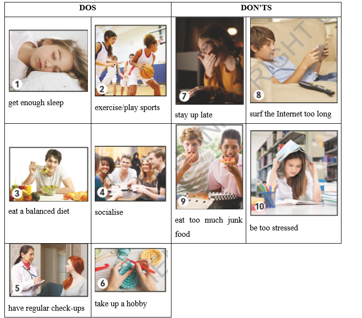(Hỏi và trả lời về lối sống của bạn. Nói về giấc ngủ, chế độ ăn uống, thể thao/tập thể dục, giao tiếp xã hội và căng thẳng.)