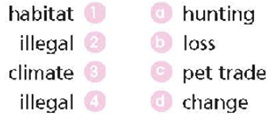 1. Match the words to make phrases.2. Complete the slogans with the words from the list. 3. Unscramble the letters to make the names of animals. 4. Complete the crossword.