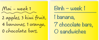 1. No, they aren’t. Today Bình’s eating crisps and a banana and Mai complains they he never has any healthy food. (Không, họ không phải vậy. Hôm nay Bình đang ăn khoai tây chiên giòn và một quả chuối và Mai phàn nàn rằng anh ấy không bao giờ có bất kỳ thức ăn lành mạnh nào.)
