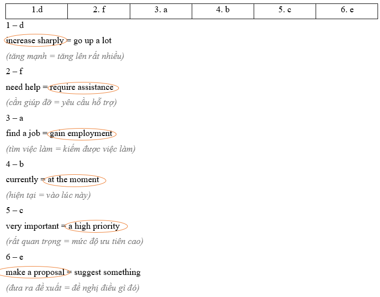 (Đọc Chiến lược Nghe 2. Nối các cụm từ (1-6) với ý nghĩa tương tự (a-f). Sau đó khoanh tròn cụm từ trang trọng trong mỗi cặp.)