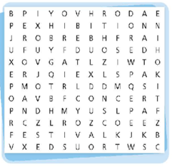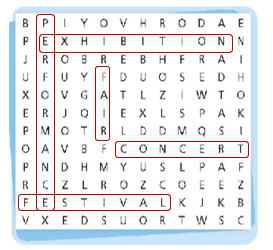 1. Label the pictures with the words/ phrases from the list. 2. Find five words related to cultural events in the word search. 3. Complete the sentences with the words/phrases from Exercise 1. 4. Complete the text with the words from Exercise 1.