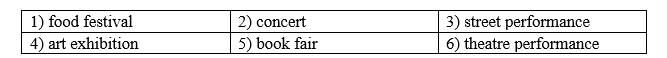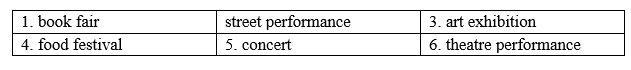 Hi, readers! I’m so excited about all the cultural events in my city this summer. Next weekend, I’m going to try delicious dishes at a(n) 1) _______. Then, I’m going to a(n) 2) _______ with six different bands. A(n) 3) _______with dancers is going to take place at the centre square. There’s also a(n) 4) _______ at the museum and a(n) 5) _______ where I can find something new to read. Tonight, I’m attending a(n) 6) _______ of Shakespeare’s Macbeth. I’ll tell you about it later. Let me know about your summer plans in the comments.