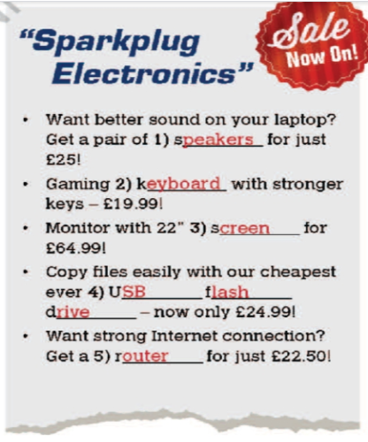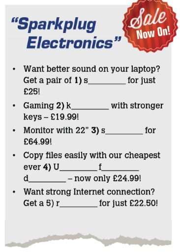1. Label the picture using tower, screen, mouse, keyboard, router, speakers and USB flash drive. 2. Choose the correct option. 3. Fill in the correct word.