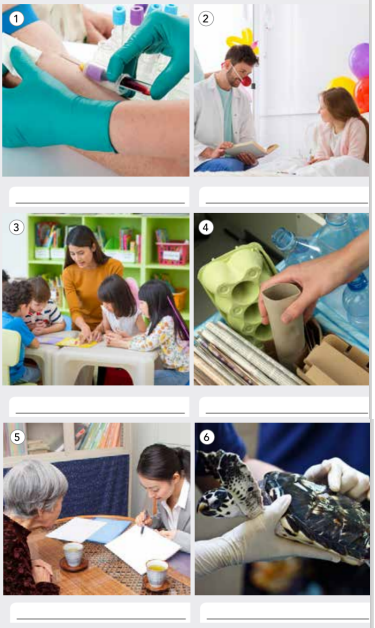 collect rubbish            help the animals            donate blood               help the elderly                     teach children             do volunteer                work in the hospital