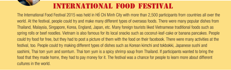 Lễ hội ẩm thực quốc tế 2015 được diễn ra tại thành phố Hồ Chí Minh với hơn 2,500 người tham gia từ nhiều đất nước trên toàn thế giới. Tại lễ hội, mọi người có thể thử và làm nhiều loại món ăn khác nhau. Có rất nhiều món ăn phổ biến đến từ Thái Lan, Malaysia, Singapore, Hàn Quốc, Anh, Nhật Bản,…. Nhiều khách du lịch nước ngoài thích đồ ăn truyền thống Việt Nam như gỏi cuốn hay phở bò. Việt Nam cũng nổi tiếng về đồ ăn vặt địa phương như là bánh lá dừa hay bánh chuối. Mọi người có thể ăn thử miễn phí, nhưng họ cần phải đăng tấm hình của họ với đồ ăn trên Facebook của họ. Cũng có rất nhiều hoạt động ở lễ hội. Mọi người có thể thử làm nhiều loại món ăn khác nhau như kimchi hay tokbokki Hàn Quốc, sushi và sashimi Nhật Bản, tom yum và somtum Thái Lan. Tom yum Thái là món súp tôm cay từ Thái. Nếu người tham gia muốn mang đồ ăn mà họ làm về nhà, họ phải trả tiền cho nó. Lễ hội đó là 1 cơ hội cho mọi người họ nhiều hơn về các văn hoá khác trên thế giới.