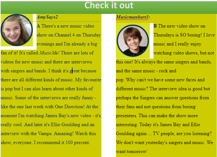 A Có một chương trình video ca nhạc mới trên Kênh 4 vào các tối thứ Năm và tôi là một người hâm mộ lớn của nó! Nó có tên là MusicMe! Có rất nhiều video về âm nhạc mới và có các cuộc phỏng vấn với các ca sĩ và ban nhạc. Tôi nghĩ nó thật tuyệt vì có tất cả các thể loại âm nhạc khác nhau. Yêu thích của tôi là nhạc pop nhưng tôi cũng có thể tìm hiểu về các loại âm nhạc khác. Một số cuộc phỏng vấn thực sự hài hước – như cuộc phỏng vấn tuần trước với One Direction! Hiện tại, tôi đang xem video mới của James Bay – nó thực sự rất hay. Và sau đó là Ellie Goulding và một cuộc phỏng vấn với Vamps. Thật tuyệt! Xem chương trình này đi, mọi người. Tôi đề cử nó 100 phần trăm.