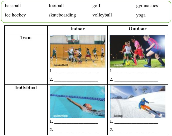 A. Write the following sports in the correct box, according to the categories.