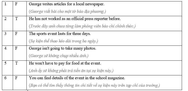 (Tên tôi là George Samson và tôi mười sáu tuổi. Tôi thường viết bài cho tạp chí của trường vì tôi muốn trở thành nhà báo khi ra trường. Tuần tới tôi sẽ có chuyến đi đầu tiên với tư cách là phóng viên báo chí chính thức. Tôi đang tham dự một sự kiện thể thao dành cho thanh thiếu niên khuyết tật và tôi thực sự mong chờ nó. Sự kiện này bắt đầu vào thứ Sáu ngày 14 tháng 5 và kéo dài trong bốn ngày. Tôi chỉ được vào cửa vào Thứ Bảy và Chủ Nhật, nhưng tôi chắc chắn sẽ có nhiều thứ để xem. Tôi không muốn bỏ lỡ bất kỳ sự phấn khích nào! Là một nhà báo trẻ, tôi có thể vào tất cả các nhà thi đấu thể thao và cả bể bơi. Tất nhiên, tôi sẽ mang theo máy ảnh của mình và tôi được phép chụp bao nhiêu ảnh tùy thích – tôi có thể sẽ chụp rất nhiều ảnh! Tuy nhiên, video không được phép. Có những phòng phỏng vấn đặc biệt nơi tôi có thể nói chuyện với một số đối thủ cạnh tranh. Họ chỉ mở cửa từ mười giờ sáng đến hai giờ chiều nên tôi phải sắp xếp thật chu đáo! Ngoài ra còn có một lều ăn đặc biệt nơi tất cả các nhà báo có thể nhận đồ ăn miễn phí vào giờ ăn trưa, vì vậy tôi sẽ có thể đi chơi với một số nhà báo chuyên nghiệp! Nếu bạn yêu thích thể thao, tại sao không đến tham dự sự kiện? Bạn có thể giúp đỡ như một tình nguyện viên nếu bạn muốn. Hãy xem trang web để biết thêm chi tiết và xem báo cáo của tôi trên tạp chí tháng tới!)