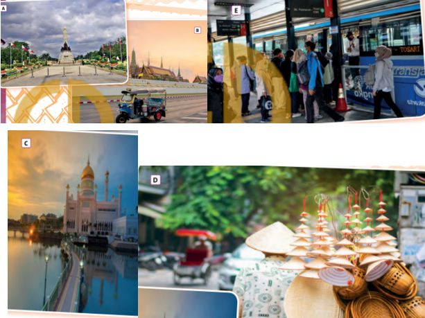 (Làm việc theo cặp. Nối các bức ảnh từ A-E với các thành phố và quốc gia. Các quốc gia có điểm gì chung?)