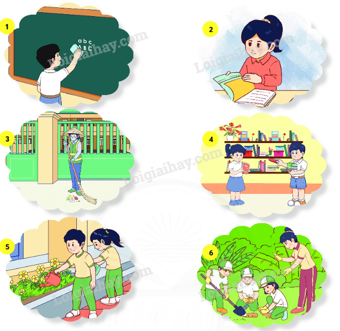 – Thắng và Loan tưới cây ở bồn hoa trước cửa lớp.