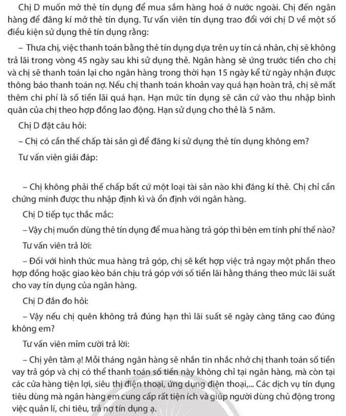 – Dựa vào hiểu biết của bản thân, giải thích lí do vì sao phải sử dụng dịch vụ tín dụng có trách nhiệm.