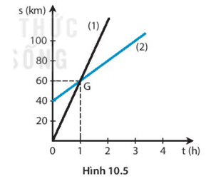 Hình 10.5 là đồ thị quãng đường – thời gian của một xe đạp và một người đi mô tô. Biết mô tô chuyển động nhanh hơn xe đạp.