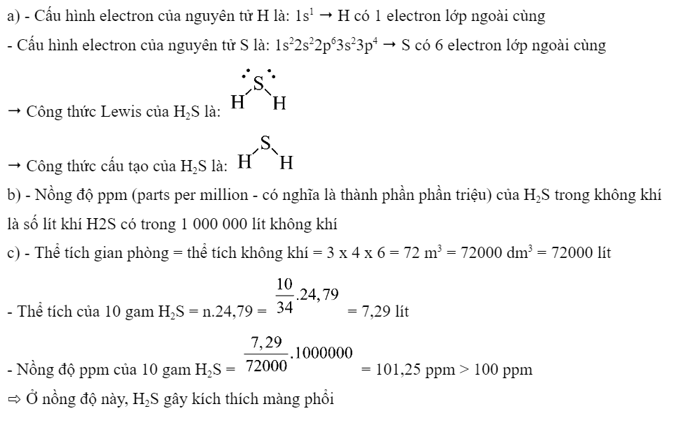 c) Một gian phòng trống (25°C; 1 bar) có kích thước 3 m x 4 m x 6m bị nhiễm 10 gam khí H2S. Tính nồng độ ppm của H2S trong gian phòng trên. Đánh giá mức độ độc hại của H2S trong trường hợp này. Cho biết 1 mol khi ở 25°C và 1 bar có thể tích 24,79 L.