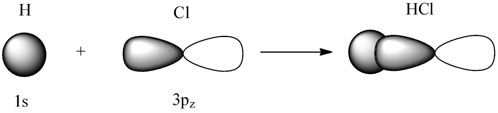 Sơ đồ biểu diễn sự xen phủ giữa orbital 1s của nguyên tử hydrogen và orbital 3p của nguyên tử chlorine trong sự hình thành liên kết ở trong phân tử hydrogen chloride (HCl):