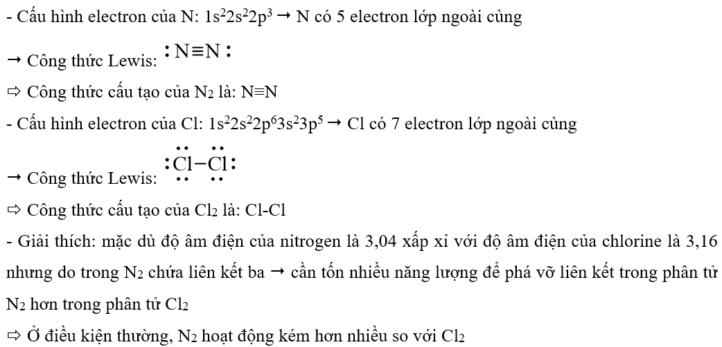 Giải thích vì sao độ âm điện của nitrogen là 3,04 xấp xỉ với độ âm điện của chlorine là 3,16 nhưng ở điều kiện thường, nitrogen kém hoạt động hơn nhiều so với chlorine.