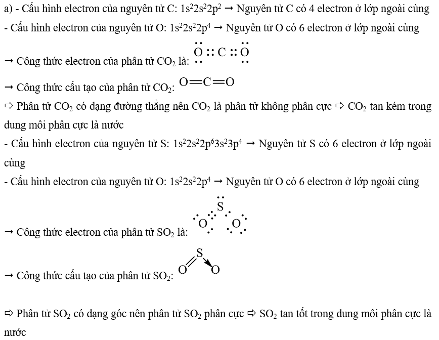 a) Ở 25°C và 0,99 atm, khả năng tan của carbon dioxide (CO2) trong nước là 1,45 gam/L, kém hơn nhiều so với sulfur dioxide (SO2) là 94 gam/L. Giải thích nguyên nhân sự khác biệt.