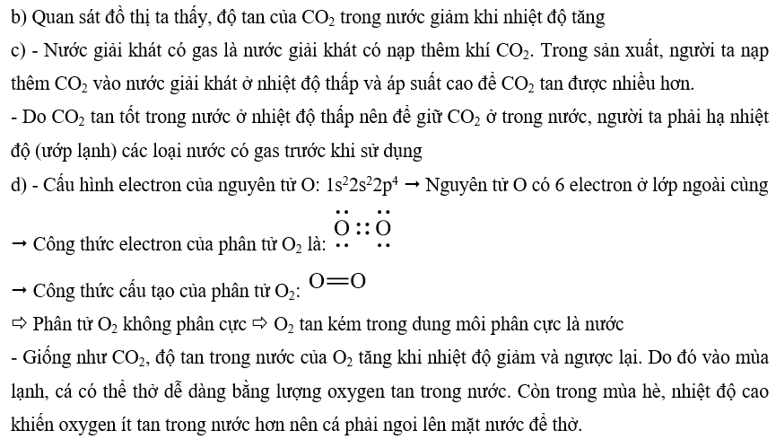 b) Dựa vào đồ thị để rút ra nhận xét: độ tan của CO2 trong nước giảm khi nhiệt độ tăng