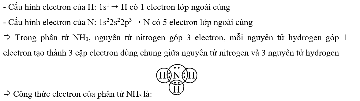 Trong phân tử ammonia (NH3), số cặp electron chung giữa nguyên tử nitrogen và các nguyên tử hydrogen là