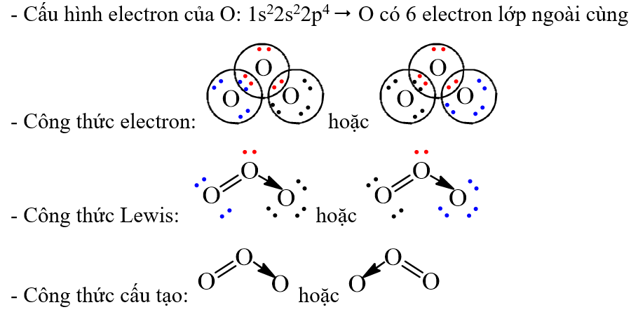 Ozone (O3) là một loại khi có tính oxi hoá mạnh, phân tử gồm ba nguyên tử oxygen. Ozone xuất hiện ở tầng đối lưu và tầng binh lưu của khí quyển. Tuy thuộc vào vị trí của ozone trong các tầng trên mà nó ảnh hưởng đến sự sống trên Trái Đất theo các cách tốt, xấu khác nhau. Phân tử ozone có sự hiện diện liên kết cho – nhận. Viết công thức Lewis và công thức cấu tạo của ozone.