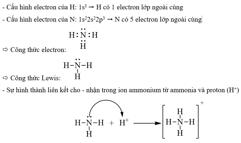 – Bước 4: Viết sự hình thành liên kết cho – nhận trong ion ammonium từ ammonia và proton (H+)