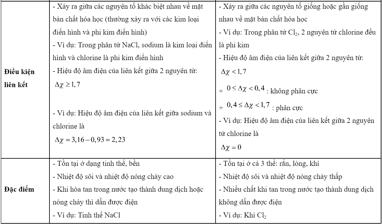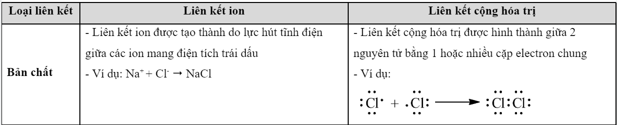 Nhận xét điểm giống nhau và khác nhau giữa liên kết ion và liên kết cộng hóa trị. Cho ví dụ.