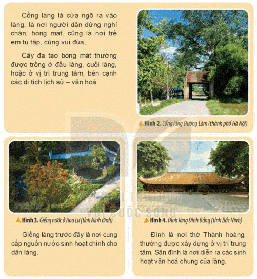 – Ở các làng quê truyền thống Bắc Bộ thường có luỹ tre xanh, cổng làng, cây đa, giếng nước, sân đình. Một số làng còn có đền, chùa, miếu,…