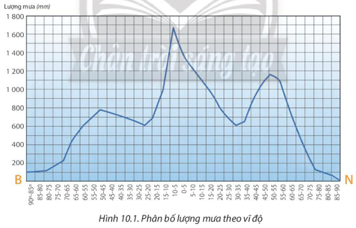 Đọc thông tin trong mục 1 (Phân bố theo vĩ độ) và quan sát hình 10.1 (chú ý lượng mưa ở các vĩ độ).