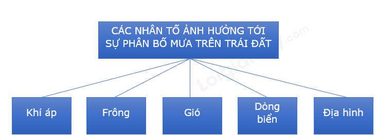 Nhớ lại các nhân tố ảnh hưởng tới sự phân bố mưa trên Trái Đất: khí áp, frông, gió, dòng biển, địa hình.