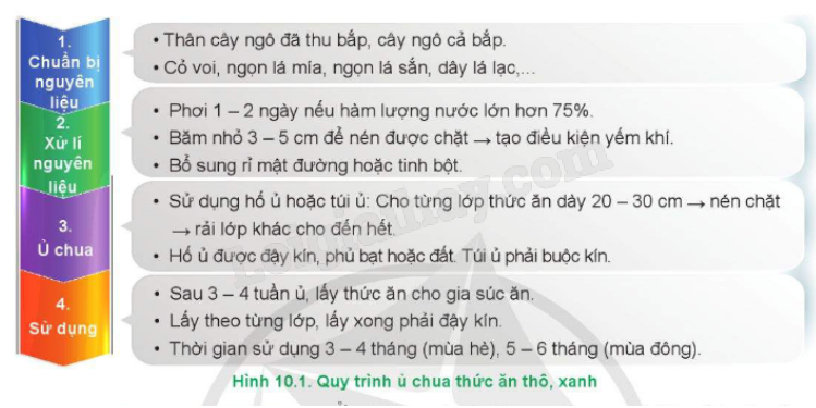 Quan sát hình 10.1, hãy mô tả các bước của quy trình ủ chua thức ăn thô, xanh.