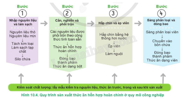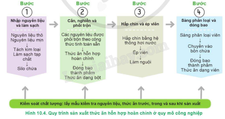 Quan sát Hình 10.4, ta thấy quy trình sản xuất thức ăn hỗn hợp gồm có 4 bước: