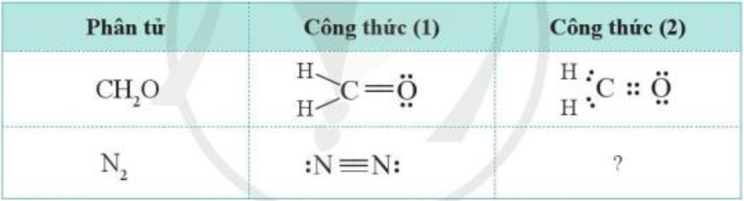 Công thức của CH2O có thể biểu diễn ở dạng công thức (1) hoặc ở dạng công thức (2). Hãy viết công thức của N2 theo cách (2) và cho biết công thức này có thể hiện được quy tắc octet hay không?