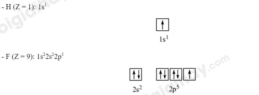 Bước 1: Viết cấu hình electron và ô orbital của lớp electron ngoài cùng cho nguyên tử H, F.