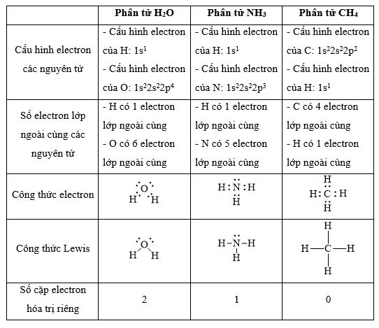 Thiết lập công thức Lewis cho các phân tử H2O, NH3 và CH4. Mỗi phân tử này có bao nhiêu cặp electron hóa trị riêng?