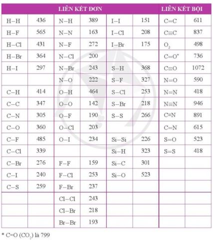 Sử dụng bảng năng lượng của một số liên kết ở điều kiện chuẩn (Phụ lục 2, SGK Hóa học 10, Cánh Diều):